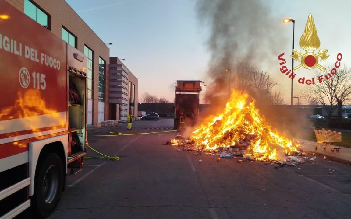 VIDEO | Veicolo di raccolta rifiuti in fiamme: autista si accorge del fumo e chiama i soccorsi
